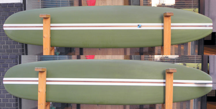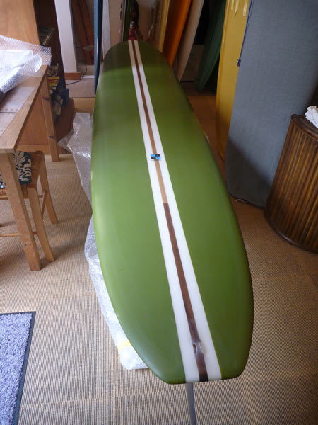 ノーズライダーとはひと味違う、クラシックロングが出来上がりました。ウェットサンドで仕上げた、オリーブグリーンとレッドシダーのストリンガーが渋い仕上がりです。