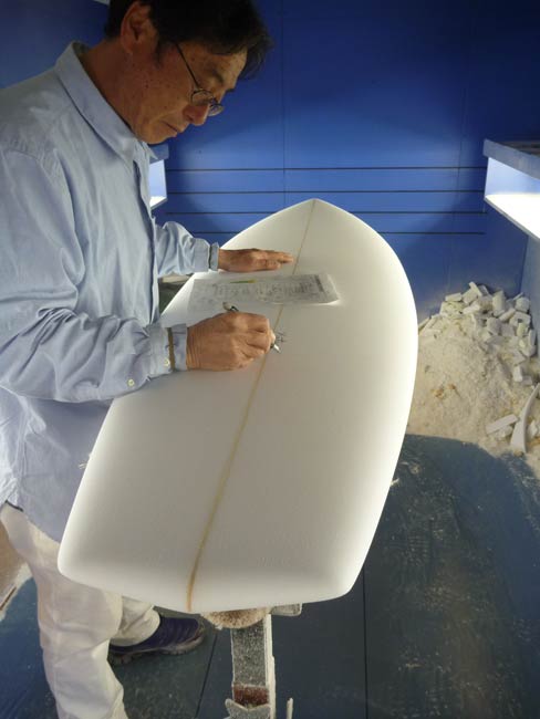 活さんは、ロングボードをシェイプ中です。クラシックなロングボードを、ということでオーダーいただきました。