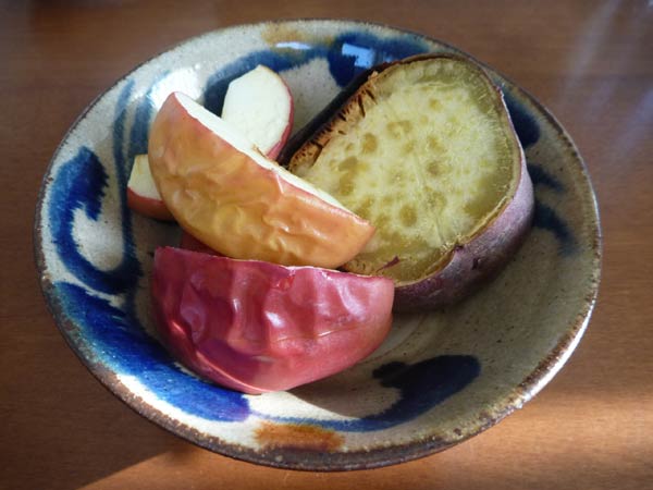 焼き芋と焼きりんご。ほっくりした焼き芋と甘酸っぱい焼いたりんごが絶妙です。これと野菜たっぷりの味噌汁で朝ごはん。芋が温玉ごはんになったりもします。