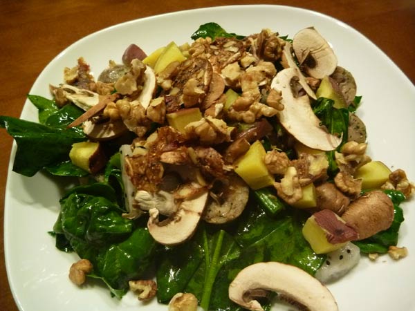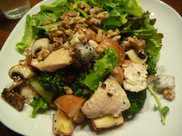 焼いた鶏むね肉、焼きりんご、ブロッコリー、マッシュルーム、くるみ、ドラゴンフルーツ、干しいちじく。それにルッコラなどの葉っぱ。ドレッシングはオリーブオイルと甘めのレモン果汁。