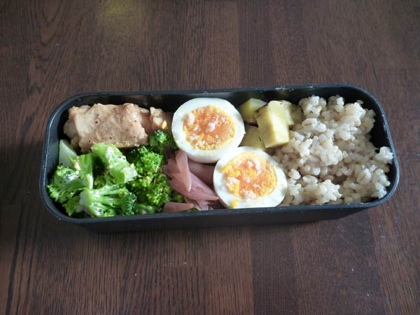 お昼は弁当。ブロッコリーに鶏肉、ゆでたまご、それに玄米と麦のごはんです。