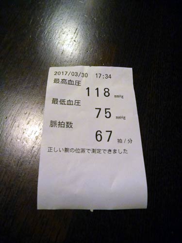 近所の生協で定期的に測っている血圧。高めの正常値だったのが、至適値になりました。お酒の影響は大きいです。
