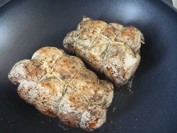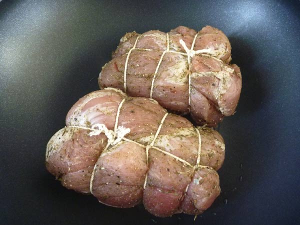 タコ糸で縛り上げ、まずはフライパンで焼き目を付けていきます。