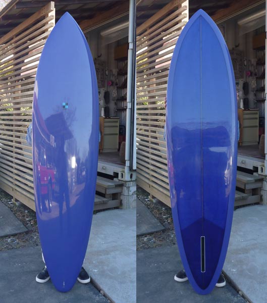 これは上のネイビーのボードと同じクラシカルなアウトラインで、少し長めの、7’6”。ライダー用です。