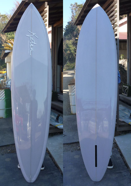 そしてもう一本のシングルフィン。前に乗ってたやつと同じアウトライン。ホットマンゴーベースのダイアモンドテール。活さんがシングルの時代に乗っていたボードの復刻版。