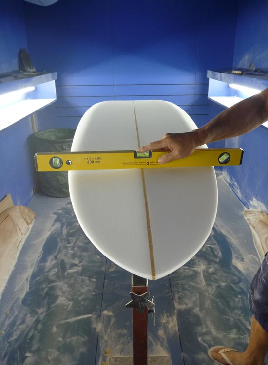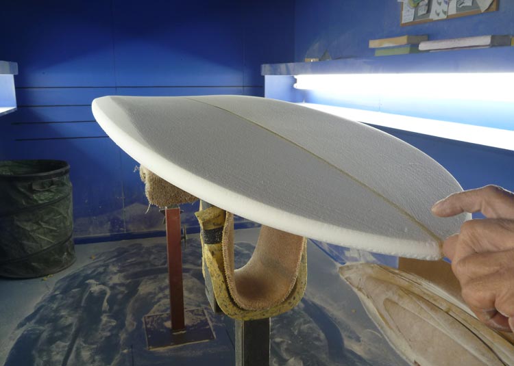活さんの指が見えますが、人差し指と親指のあいだの幅くらい、こんくらいロッカーを付けているんだよと説明してくれています。シングルフィンのプリモの場合はストリンガーの位置とレールのエッジの位置が、人差し指の位置に来ます。サイドフィン付きのTIKIにはそれだけロッカーを付けているということです。