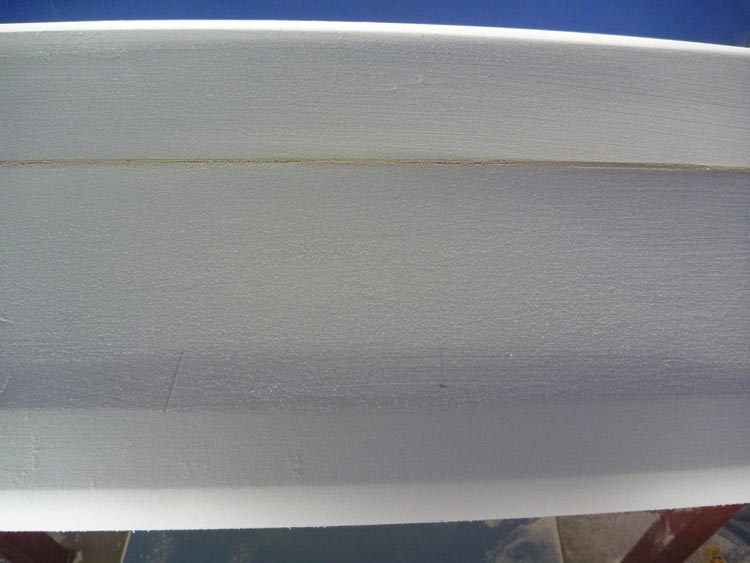これはテール寄りのボトムです。VEEが入り始めているのが分かると思います。鉛筆のマーキングはフォームのオリジナルのロッカーの位置を示しています。これを元にスピードが出るロッカーをキープしながら、コンケーブやVEEをアレンジしていきます。