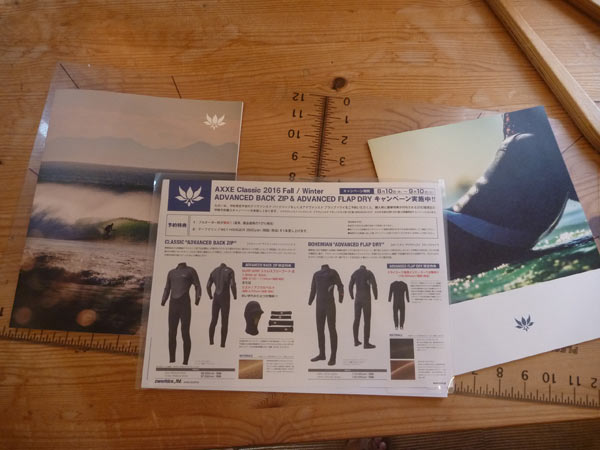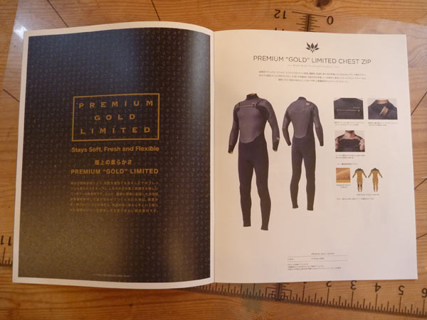 それから、以前にちょこっとご紹介しましたが(コレ)、ラバーに一番適した季節に生産した素材、プレミアムゴールドラバーを使った、ウェットスーツもオーダー受付開始します。