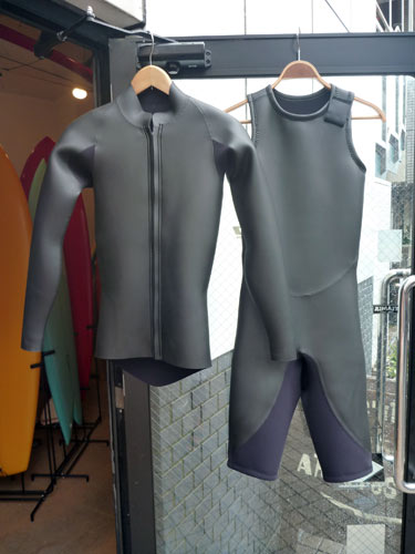 ロゴなしブラックラバーのショートジョンとジャケットが出来上がりました。DTラバーという、柔らかくて伸びが良く、コシがある着心地が良いラバーを使っています。