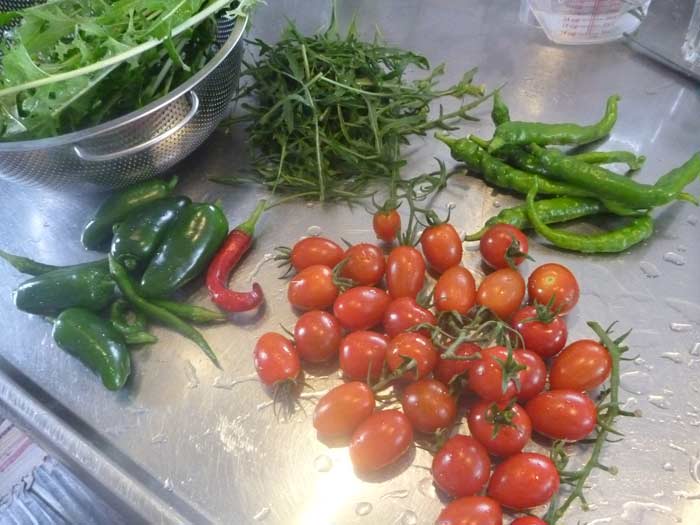 その上の濃い緑色のもじゃもじゃはルケッタ。ワイルドルッコラです。庭の雑草に混じって勝手に生えてきます。食べられそうなところだけむしって炒め物かな。薄い緑は水菜。これも落ちた種から勝手に生えてきます。スーパーの水菜と違って、苦みがあって美味しいです。