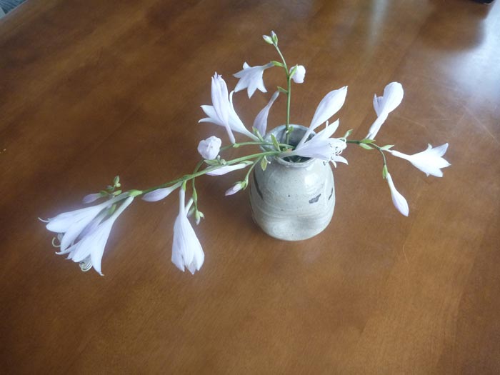 ギボウシの花はもう終わり。切り戻した花茎の先に残った花だけを活けてみました。