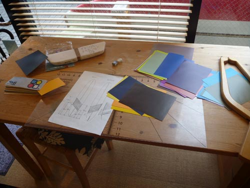 折り紙教室ではありません。昨日シェイプスタートをご紹介した、新しいロングボードの色を考えております。