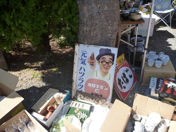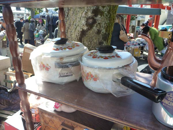 天満宮の境内は結構広くて、たくさんの古物商が露天にがらくたを並べています。古道具、キモノ、おもちゃ、骨董らしきもの、絵、石、ちょっと懐かしいものなど、和洋の区別なく雑多に並べられています。