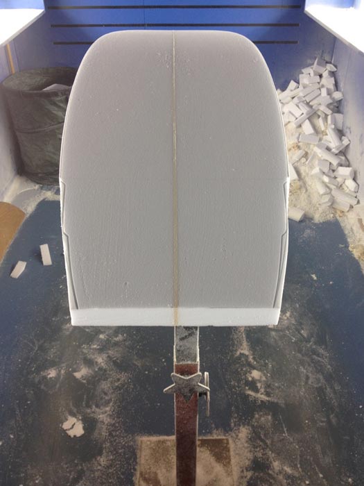 テールはこれからフィッシュテールになります。ラウンドノーズで全体的に幅広のアウトラインでフィンはクアッド。久しぶりのクアッドです。