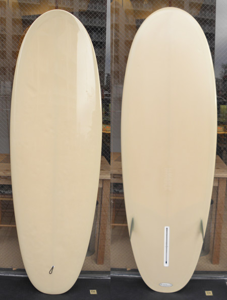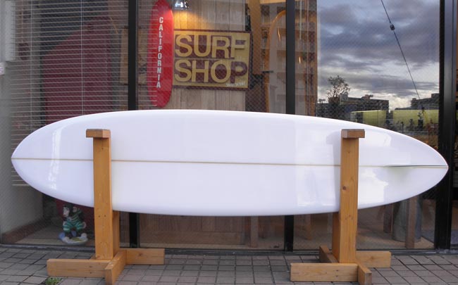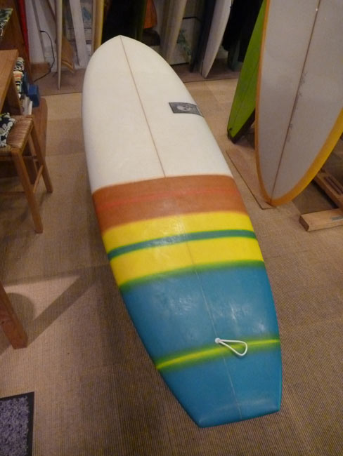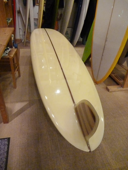 上のボードに話を戻しますと実はこのボード、少々実験的なシェイプでもありテールの幅が広すぎて、曲げるのが難しい板でした。その分、よーく走ったという記憶があります。(いくら走っても曲がらないと困りますから、皆さまにお作りしたソープ・スリッパーは改良されています。)