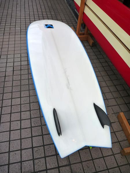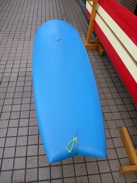 まるでスポンジで出来たソフトボードのようなカラーリング。ブルーの部分はサンディング仕上げで、ボトムのクリアの部分はバフ仕上げ。しかもせっかくの素敵なウッドフィンまでプラスチックのフィンみたいに黒く塗って、どうみてもスポンジボードでしょ?という手の込みようです。