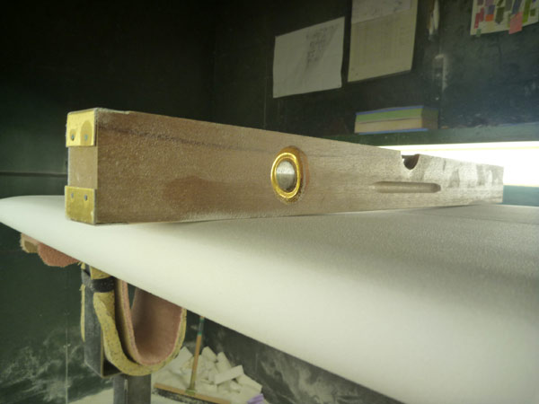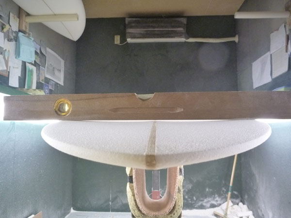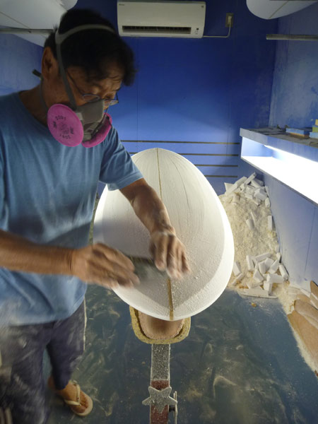 材料となるフォームの使い方もかなり独特です。ひと回り大き目のブランクスから、一番いいロッカーの部分だけを使い、ボリュームのバランス、ボトムの形、レールの形状もライダーのフィードバックのもとに一番良いと思われるものを採用しています。