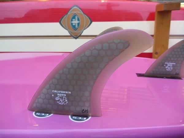 ボンザーのセンターフィンの位置は、とても興味深いです。シングルフィンではもう2~3インチ前方に付けるのが一般的ですが、ボンザーフィンが両脇に付くとボンザー特有の後方の位置になります。シングルフィンと同じような位置に付けると、ターンがフニャっとなったりします。
