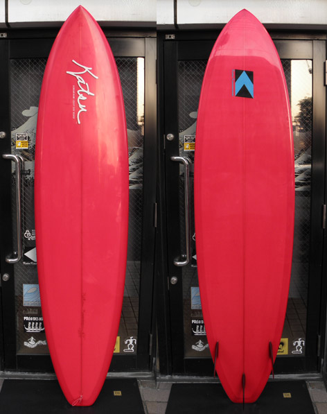 カツさんが今年たくさんシェイプしてテストしているのが、プリモのサイドフィン付きです。これは7.7のOKIDOKIと同じロッカーだと思います。シングルのプリモとはかなり違う雰囲気です。