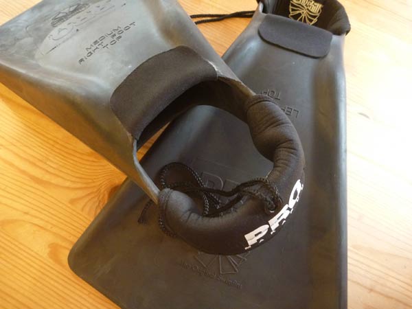 普通のマカプウフィンと違う点は、ストラップのパッドと足入れの部分の内側にジャージ素材のパッドが貼ってあるところ。ヒモはワイプアウトして脱げてしまったときの流れ止め。つまりフィンのリーシュです。