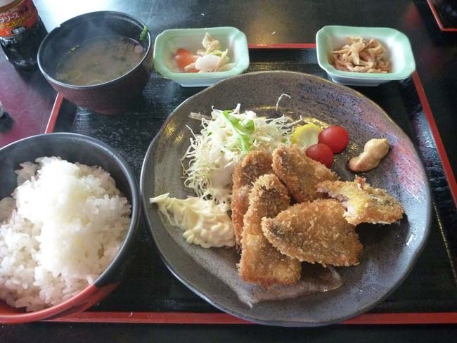 波乗りの後は駐車場の食堂でシーフード。一口かじってますが、アジフライ定食で腹ごしらえです。