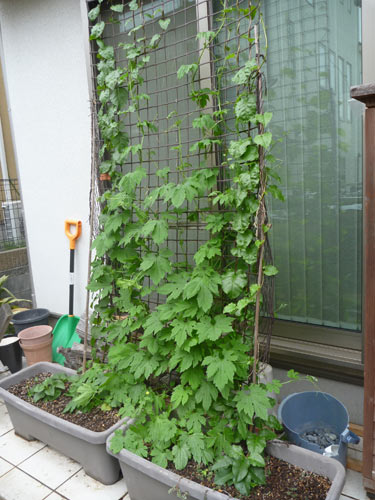 緑のカーテンも成長してきました。今年はゴーヤにオカワカメです。オカワカメはそのまま伸ばすと、茎が1本だけで日よけにならないので、摘心して枝分かれさせます。