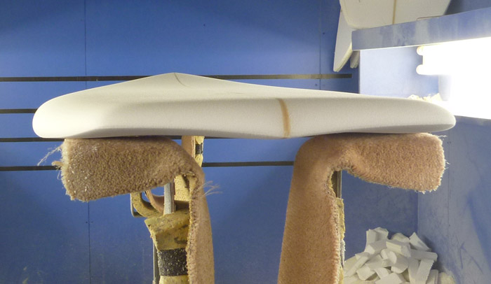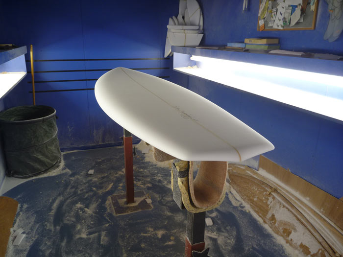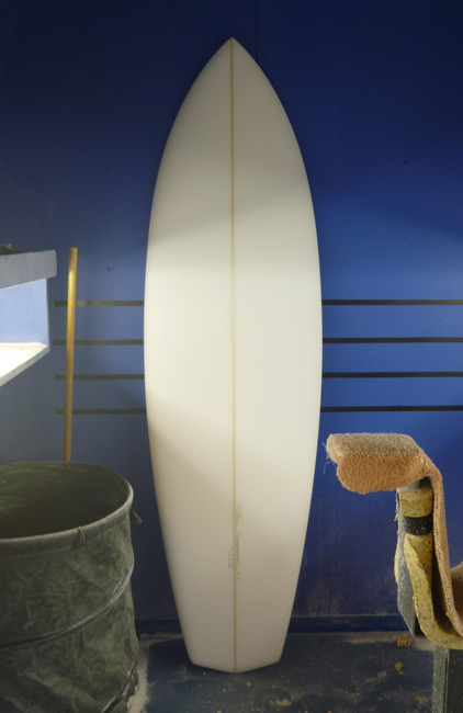 自分用のニューボードのシェイプが出来上がりました。ボトム側からの写真です。ボトム側はダウンレールのエッジがあるのでアウトラインがくっきりと見えます。テールのコンケーブもよく分かります。