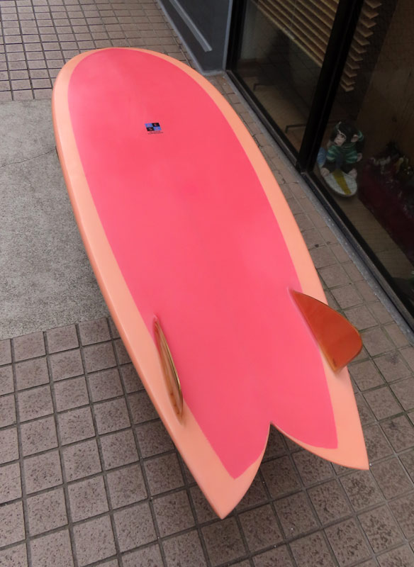 朱鷺色ピグメントのフィッシュは5’8”。覚えてますか?私が乗っていたフィッシュです、と言いつつ自分ではどんな感じだったかすっかり忘れてます(BONITAは自分用に、5’6”~6’8”で数本作って乗ってます)。