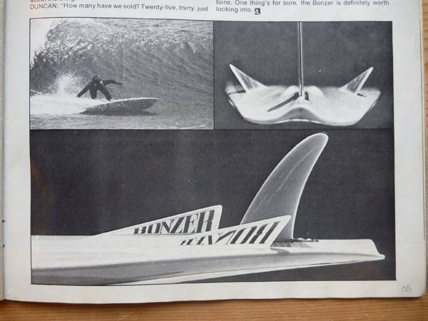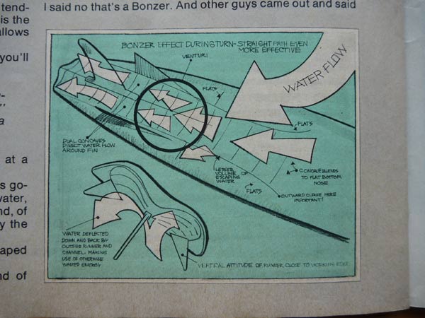 もっと具体的な説明をするとボンザーの場合、コンケーブとサイドフィンの角度を通常のスラスターフィンよりも広げて18度に設定する。こうする事によってターンした時にレールとフィンがしっかりと水に喰い込み、水中でサイドフィンがさらに大量の水を取り込むことになる。その取り込んだ水を整えて出来るだけ遠く迄流すことでボードにスピードと安定性が加わりハイパフォーマンスな動きに繋がる。