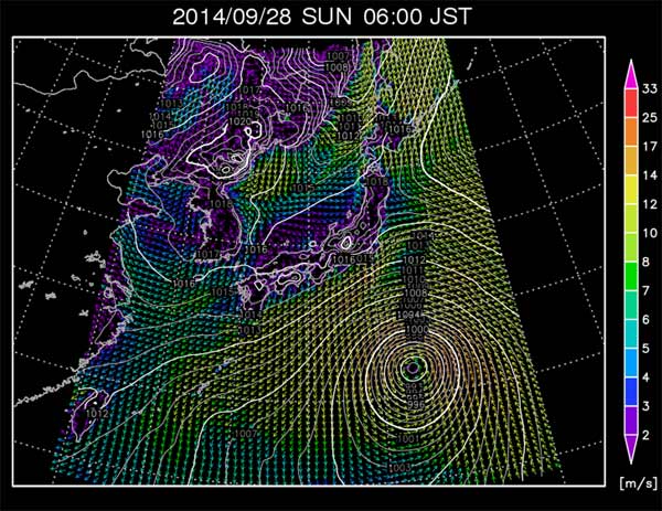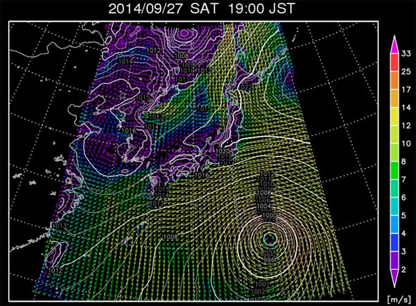 GPV気象予報サイトの27日、午後7時の予想気圧&風速図。