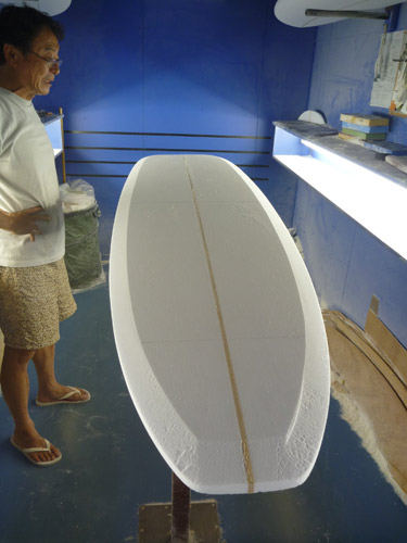 特注で頼んでいたロングボードのブランクスが届いたというので行ってきました。カツさんのシェイプルームです。