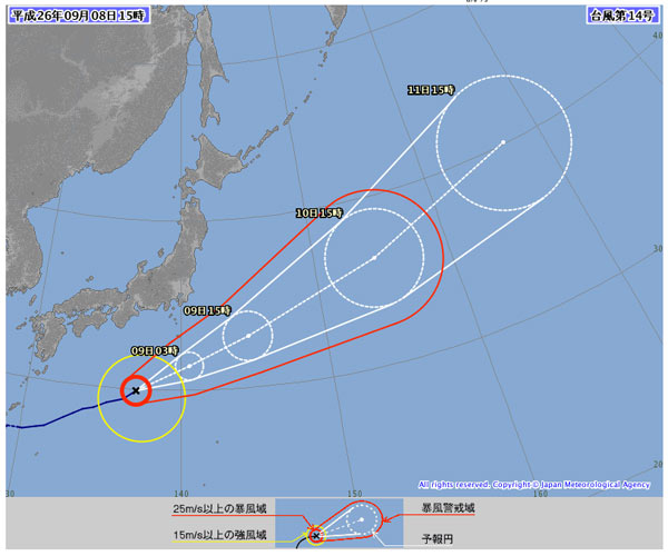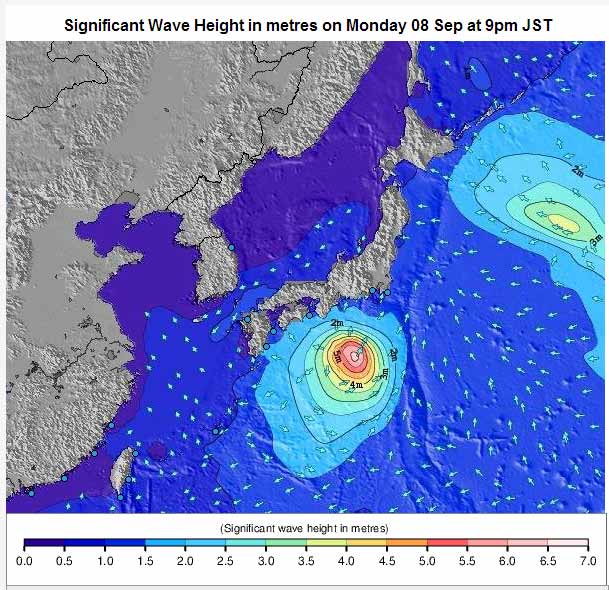 午後3時の台風の位置と今後の進路予想。波あるでしょうと思ってチェックしてみると、静岡方面の外海でコシ~ハラで台風のうねりじゃなさそう。あの位置でうねりが入らないというのは、どーいうことなんでしょう。