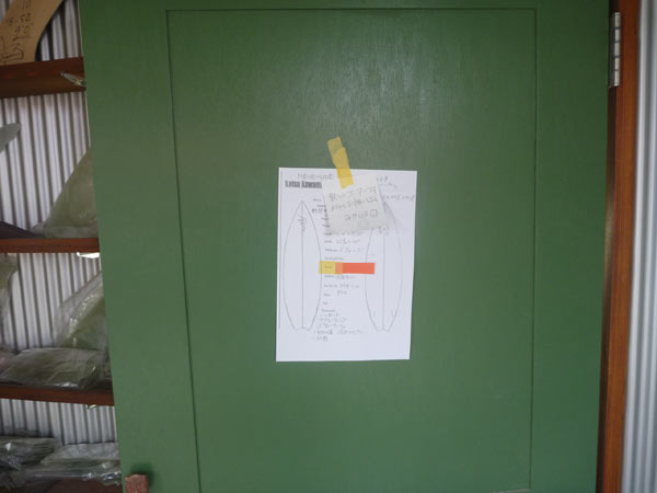 シェイプルームのドアにオーダーシート貼っときました。この方、60歳でしかもニーボードでサーフィンを始めようってんですからイカしてます。