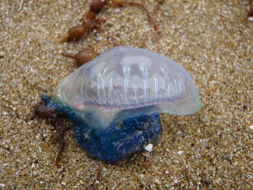 前の台風で南風が吹き続けたせいかどうかは不明ですが、カツオノエボシがたくさん打ち上げられているそうです。青い袋みたいなのが海面にプカプカ浮いているあれです。