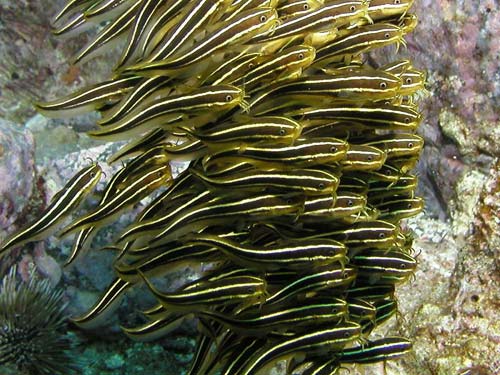 そんなの居ない?いえいえ、普通にいます。潜ってみると、リーフの陰にこんな感じで固まって泳いでます。