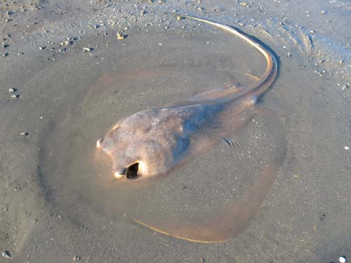 エイはビーチにもリーフにもいます。リーフでは岩の間の砂のところにいるのを見たことがあります。気が付かないで踏みつけてしまうと刺します。やられるとかなり辛いみたいです。クロコダイルハンターのスティーブ・アーウィン氏はエイに刺されて亡くなりました。