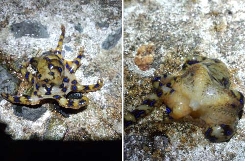 以前から湘南にもいると聞いていましたが、まだ見たことはありません。普段は普通のタコと同じような色をしているそうですが、刺激すると写真のようにきれいな青色になるそうです。