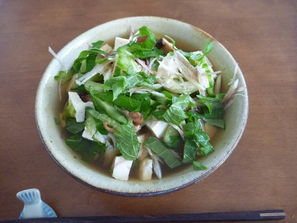 鯛の煮干と干しシイタケと昆布でとった出汁で作りました。鯛の煮干は少しクセがあるので、薬味に庭で繁っているシソを乗せ、わさびを添えます。