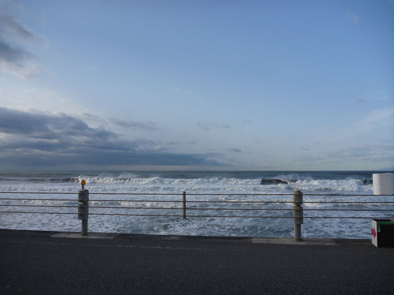 昨日は、朝の6時ちょっと前に海に着きました。途中の道のりはいつもよりクルマが少なくて、のんびりスムースに走ってこられたのですが、海岸線に出たら雰囲気が一変しました。