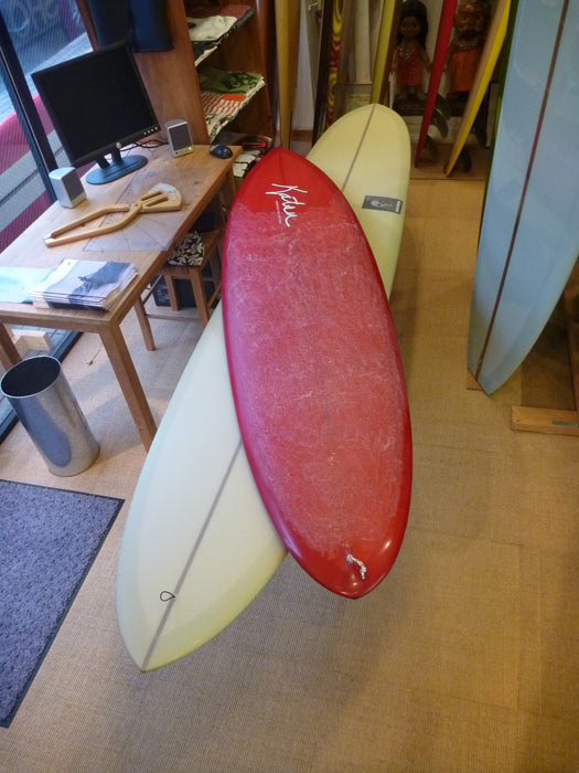 赤いボードは2014年製で、他の2本は70年代のヴィンテージです。年代を反映して、2014年製はトライフィンで、70年代製はシングルフィン。フィンは違ってもシェイプのコンセプトは3本とも揃って同じなのが面白いです。
