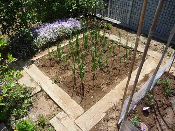 こっちはタマネギ。根元が少し膨らんできました。自分で育てるとなぜかタマネギも味が違います。奥ではタイムの花が満開です。