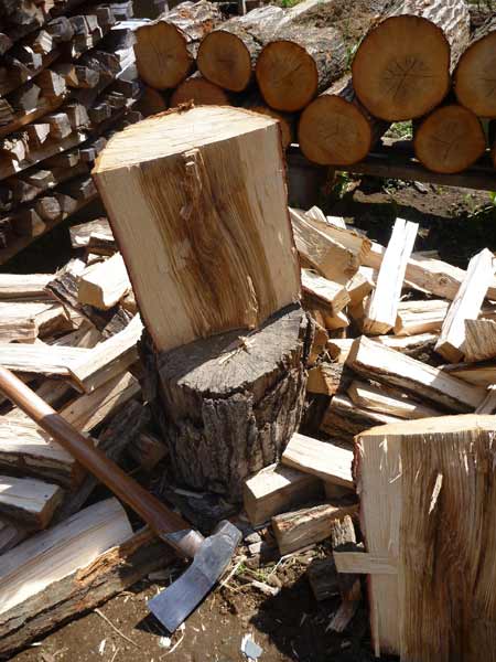 いまどき薪割りなんてやったことがある人はそんなにいないと思いますが、これが結構重労働です。丸太も斧も重たいです。