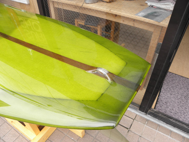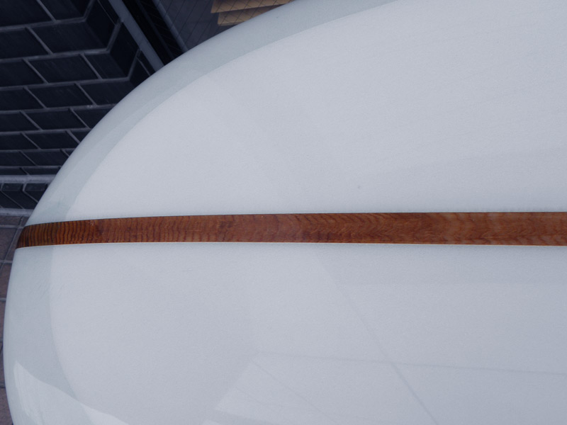 これもロングボードならではのもの。ストリンガーです。ストリンガーの役割はボードの強度アップですが、ロングボードでは装飾的なものが盛り込まれることがよくあります。カラーフォームやバルサ材とレッドウッドを組み合わせたストリンガーなどがそうですが、これは幅が広いレッドウッドのストリンガーを使っています。