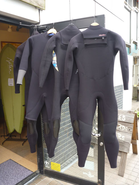 春用のウェットスーツ集合の図です。一番手前が新しく作ってもらった、AXXE CLASSICのジッパーレス3mm SUL。その隣は2011年、ちょうど3年前の同じく3mm SUL。ロンスプはSTEAMERの3/2mm エクスタジャージ。ちょいと隠れているのがAXXE CLASSICネックインの3mm。