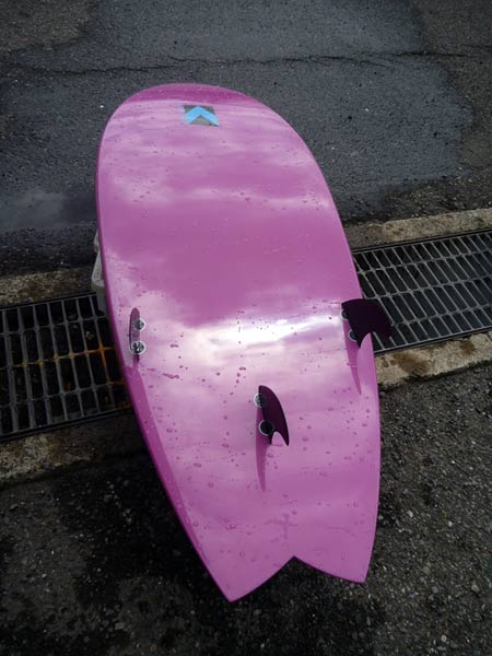 前回乗ったときには、サイドフィンはもっと小さくていいかな?と思いました(このときです)でも、小さくしてトライフィンにしたら、今度はなんか小さい…(FCSのフィンの中でも大きい方を使ってます)