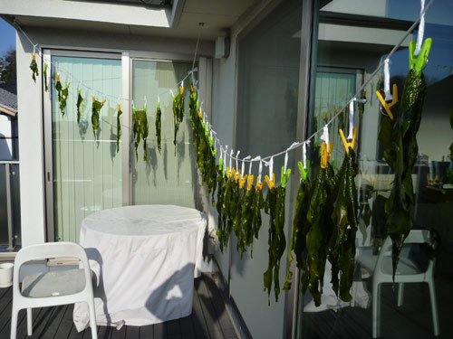 100円ショップの洗濯バサミとポリヒモで自作のワカメ干しです 笑。