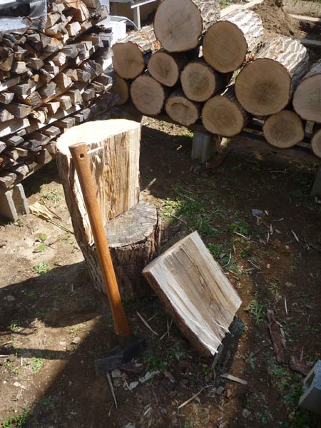 持ち上げるのがやっとの40センチオーバーでも節が無いと簡単に割れます。今回はこんなきれいな玉ばかりです。薪割り、結構好きです。ここでもアックスが大活躍(つづりが違うか)