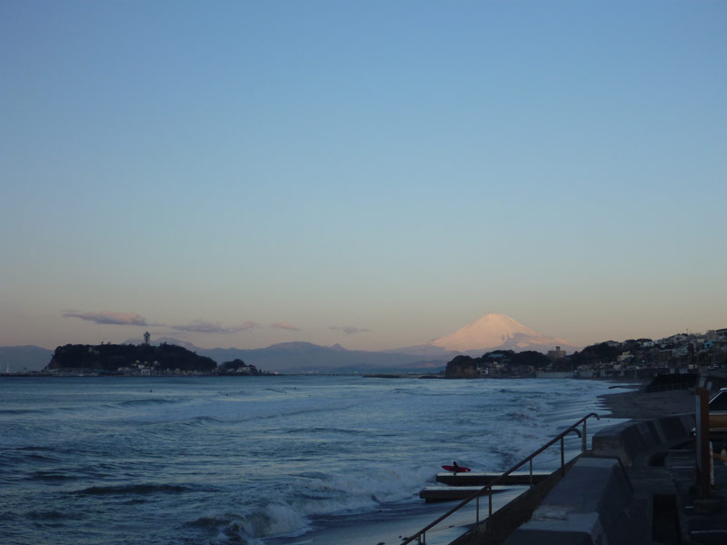 3月6日、朝6時。朝日に照らされた真っ白な富士山がきれいです。だいぶ日の出が早くなってきました。しかし、寒い!北風ピューピューでウェットに着替えるのに気合い一発です。