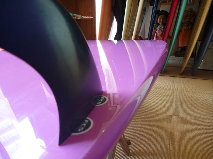 フィンはツインのセンターに小さなスタビライザーを付けた、ツインスタビという組み合わせですが、エッジがこれだけ効いている上に大きなツインのサイドフィンは、もしかしたら不要かもしれません。ターンのときのレール側の抵抗は十分すぎるように思います。サイドフィンはもっと小さくていいのかもです。