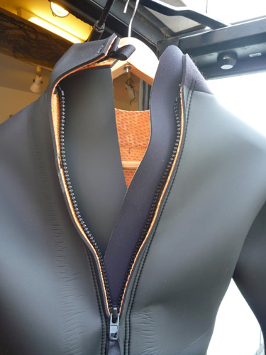 背中が大きく開くので着替えるのは、ネックインやジッパーレスに比べるとかなり楽です。そういえば昔、冬の寒い日に下半身だけウェットを着た状態でクルマを運転して海に行ったこともありました。途中(ちょっと変な格好ですが)トイレにも行けるし、海に着いたら狭いクルマの中でも寒い思いをせずにウェットに着替えられます。ネックインやジッパーレスでは出来ません。
